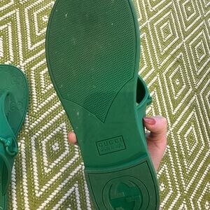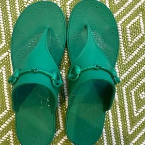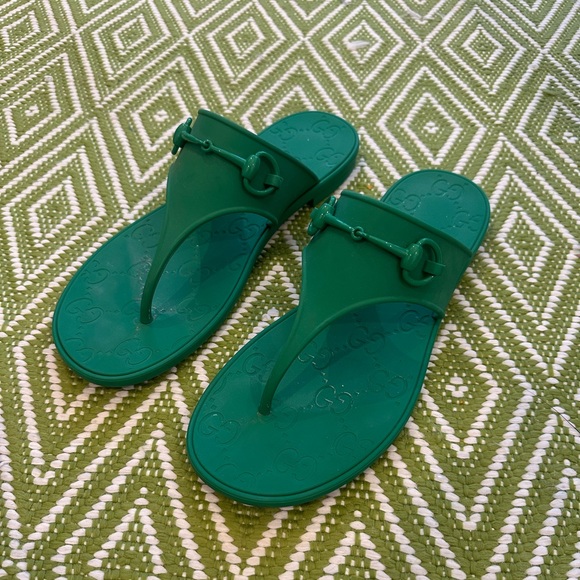 Stylish green thong sandals with embossed logo detailing. Lightweight jelly construction for easy wear. Slip-on design with signature horsebit-inspired hardware. Versatile green color perfect for casual summer looks.