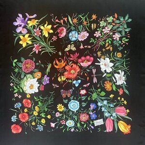 Gucci Scarf Flora Print Logo Black Multicolor Silk Wrap