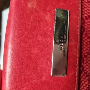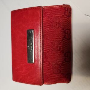Authentic Gucci red GG logo leather and canvas wallet. Leather is buttery soft with 2 compartments. Front compartment has a leather snap with 2 sections for coins. Back compartment is a snap for billfold and 8 credit card slots. In good pre-loved condition. Measuring 4" wide by 3 1/2" tall.