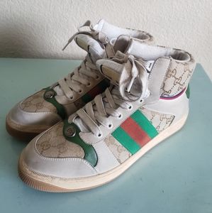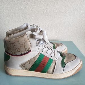 Gucci Men's GG Canvas Screener High-top Sneakers 8. Gucci Screener GG High Top Brand New, Never worn. Distressed appearance this is a character trait not a flaw. Guaranteed Authentic. Condition is "New, no dustbags or box, there are sku numbers on bottom right sole to secure no retail return for full value. This is a Gucci size 8 shoe fits MENS US 8.5, 9. .. No box. Smoke and pet free home. Guaranteed authentic. Final sale. We are aggressively priced to sell. These are so cool. AMAZING. NEW!!