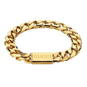 The signature fashion jewelry line featuring the Gucci script appears in a shiny new finish, with the name of the House enriching necklaces and bracelets as a central charm or pendant. Here an engraved Gucci tag defines this gourmette chain bracelet in gold-toned metal.