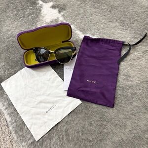 Here’s a super cute pair of Gucci sunglasses. These are the Semi-Rimless Cat Eye Sunglasses. Comes with the original case and dust bag and shine cloth. Excellent shape, only worn a handful of times and kept in the case, hoping they find a good home where someone won’t be as nervous to wear them lol. They were original bought from Nordstrom. Classic and chic! Perfect for everyday wear.