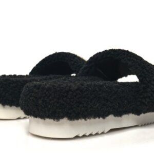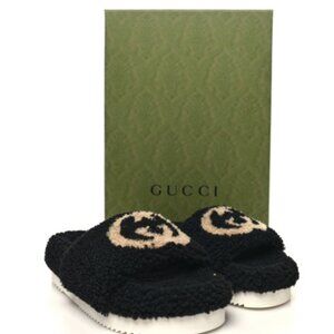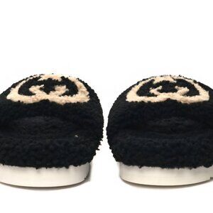 These are authentic Gucci Shearling Eileen Slides in black and butterscotch in size 37. These shoes are crafted of Shearling fur and feature an interlocking G logo on the front with a while luggage Platform sole. Comes with original box.
