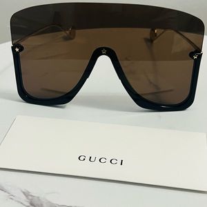 Brand new and authentic Gucci shield sunglasses. Black frames with solid brown lens. Golden arms with gold stars by temples and center of glasses. Comes with Gucci carrying case, polishing cloth and authentication card.