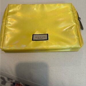 Stylish Gucci cosmetic case in shimmering yellow. Ideal for organizing beauty essentials. Gucci beauty promotional bag.