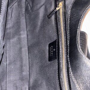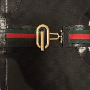 Black shoulder bag, GG monogram with leather handles, gold hardware, letter G buckle to close, gucci stripe down the middle, slightly worn.