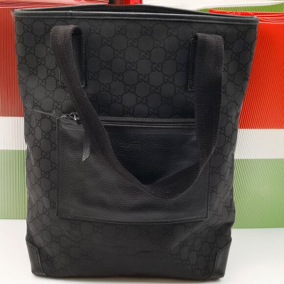 The Gucci Shoulder Monogram Tote Bag in Black and Gray is a large rectangular tote bag featuring the iconic Gucci GG canvas and leather design. The bag has a zip closure, double black handles, and inner pockets for organization. Made with matte finish canvas and black leather lining, this tote bag is perfect for travel, casual outings, formal events, workwear, and business occasions. The Gucci GG pattern adds a touch of luxury to this classic designer piece, which is both stylish and practical for everyday use. Made in Italy, this tote bag exudes elegance and sophistication.