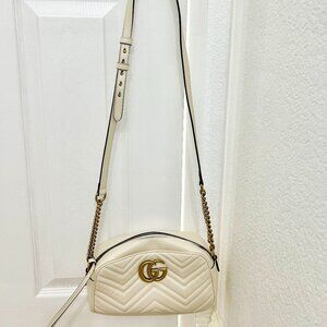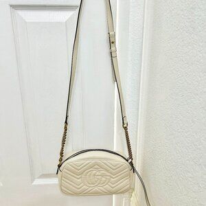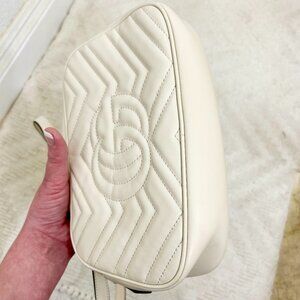 Gucci white leather GG Marmot shoulder bag. I purchased it new from Gucci website a couple years ago for $1,950. Barely used. Great condition, no scratches or scuffs. There's a small lipstick spot on the inside of the purse (picture of it included).