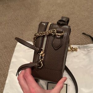Stylish Gucci crossbody with iconic pattern. Features brown leather accents and gold hardware. Perfect for everyday elegance.