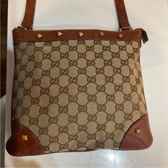 Stylish Gucci shoulder bag with iconic pattern. Rich brown leather accents. Perfect for any occasion.
