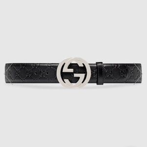 The Interlocking G buckle belt, made in heat debossed Gucci Signature leather with a defined print and firm texture.