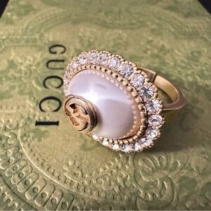 Gucci Signed Interlocking G Oval Embellished Crystal Pearl Unisex Adjustable Ring