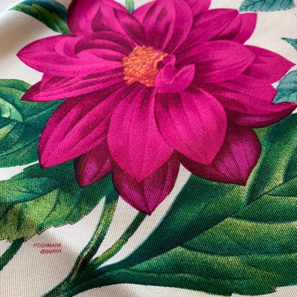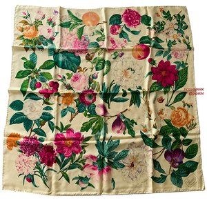 Gucci silk scarf with a yellow background. It featured blooming roses, peonies, hydrangeas, butterflies, and peaches.