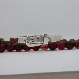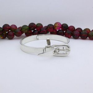 The Gucci Silver Belt Buckle Bracelet is a stylish, eye-catching accessory that is sure to add a touch of sophistication to any outfit. Crafted from sterling silver, this bracelet features an intricate buckle clasp that is securely fastened with a safety clasp closure. The bracelet is adjustable to fit any wrist size, and can be worn alone or stacked with other bracelets for a more dramatic look. This elegant bracelet will be a timeless addition to any jewelry collection.