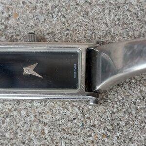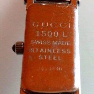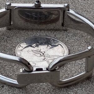 This ladies watch by GUCCI is amazing find for the lady with a smaller wrist. It is simplicity and luxury exemplified. Its is constructed in a streamlined silver body, with a black face and onyx crown top. The hands are also silver. There is no second hand. There is barely room for it on the diminutive rectangular face. The face of the watch is branded "GUCCI" in silver the exterior of the horsebit closure is also branded "GUCCI". The markings on the rear and the face inform that the watch is "Swiss Made" It is a quartz movement. Measured outside the watch around is 7", that is . . . a mere 7".