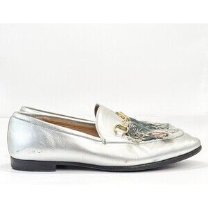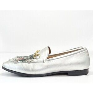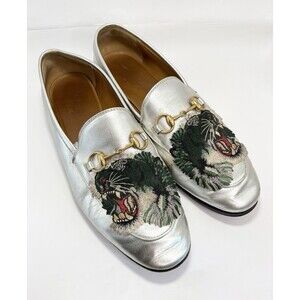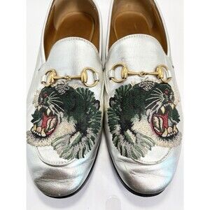 Gucci Silver Jordaan Loafers Gold Horse-bit Detail w/ Tiger Patch Sz EU 37.5 7.5