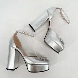 Gucci Silver Metallic Leather Crystal GG Platform Ankle Strap Block Heel Pump