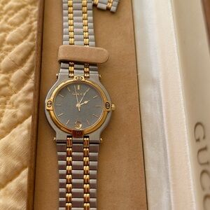 This exquisite Mens Gucci 9000 M watch combines the elegance of silver and gold in a sleek, modern design. Its minimalist circular face and linked metal band make it a standout accessory for any occasion.