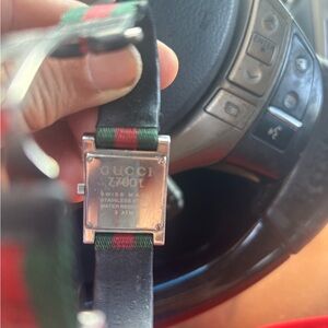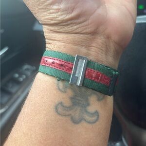 Stylish Gucci watch with a silver case and green-red striped band. Elegant and timeless design.