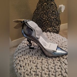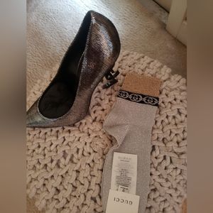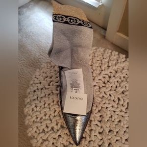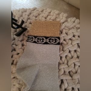 I had to pair these lovely socks with the pewter YSL logo Opyum pumps to pair on top of your favorite skinny jeans... and yes it's quite alright to mix designers! These socks are lurex gold, silver, and have the GG logo featured in black. The size is Medium 9, tags are attached. Made in Italy