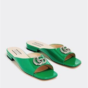Gucci Size 37/ 7 Double G Crystals Slip On Patent Leather Green Flat Sandal NIB