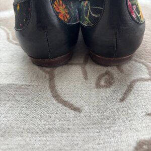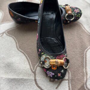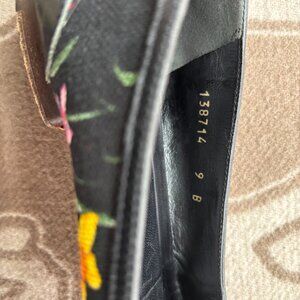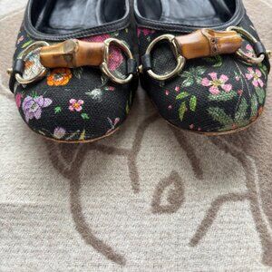 Gucci Size 9 canvas black floral bit loafers. Bamboo and gold bit accent on front.