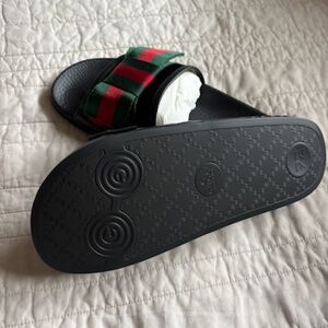 Authentic Gucci Satin Slide Black footbed with Green & Red satin detail Box and Dust bag included.