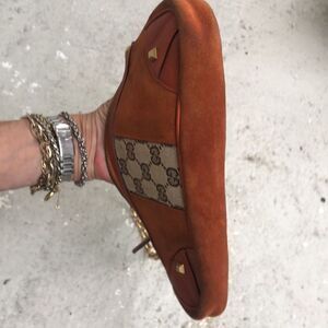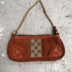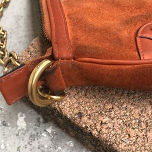 Rusty orange in color, The bag has zero damage but as you see from the pictures it does need cleaning. Chain is perfect. Inside is clean. Measuring across the bottom is 9” x 4” x 1.5”. Measurements are approximate.