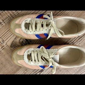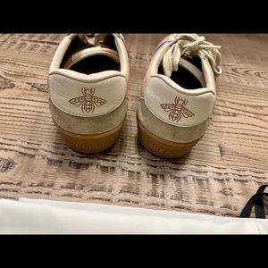 Super comfortable Gucci leather sneakers. Purchased brand new less than 2 years ago. Only selling because they no longer fit my feet after I had my child. Sad to see them go..perfect condition. I also have replacement laces!!***