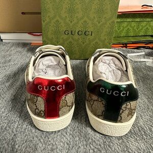 Stylish Gucci sneakers featuring the iconic monogram pattern. Accented with red and green stripes and white laces.