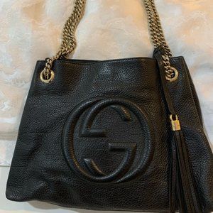 Gucci black leather Soho shoulder bag - medium size with double chain shoulder and leather tassel. Dust bag included. Very good condition. Shows no signs of use except mild stains on inside lining. Approx size - 17” wide x 5.5” gusset x 12.5” tall.