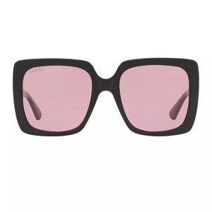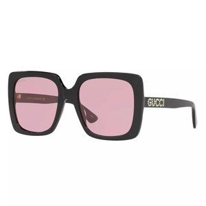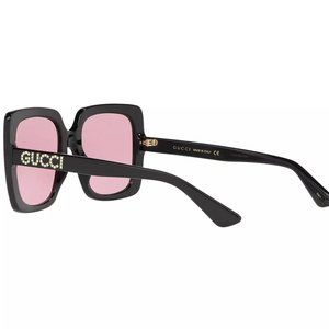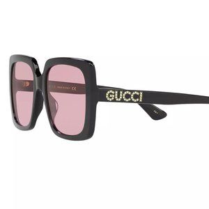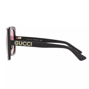The Gucci Square Frame Crystal Logo Sunglasses in Black are crafted from a smooth, durable acetate in Italy. These sunglasses feature an oversized, square lens frame, a crystal studded Gucci name on ear ear piece, and tinted pink lenses.
