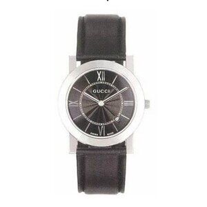 Authentic Gucci, Stainless Steel & Calf Leather Swiss Made Watch with Square G Motif Time Pie