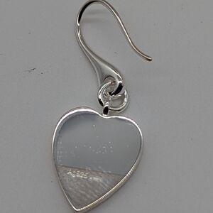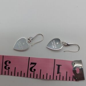 Classic Gucci dangle earrings in 925 sterling silver. Feature a polished heart charm engraved with "Gucci made in Italy" on French hooks. Lightweight and timeless.