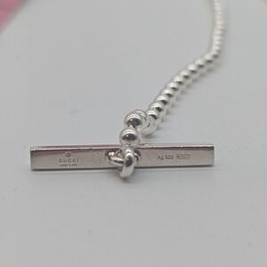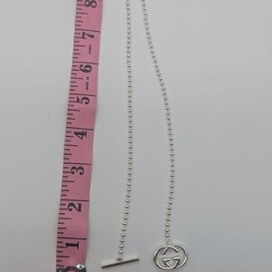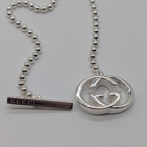 This elegant Gucci necklace features the iconic interlocking GG logo pendant in polished sterling silver, suspended from a beaded chain for a modern touch. The classic design is finished with a Gucci-engraved bar toggle closure, adding a unique and sophisticated detail. Perfect for layering or wearing alone, this timeless piece is a must-have for any Gucci lover.