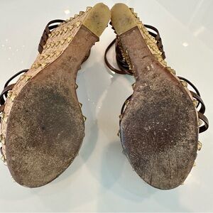 Gucci Studded Cecyl Leather Wedges in a Brown/Bronze color with platform, studded cork heel, strappy toe, and buckled ankle straps. Size 36. 5. Approximate 5.5" heel, 1.75" platform. Worn and in good condition. *See all photos for condition of scuffs/soles, and wear on heels/soles. **Please note missing and crushed studs.