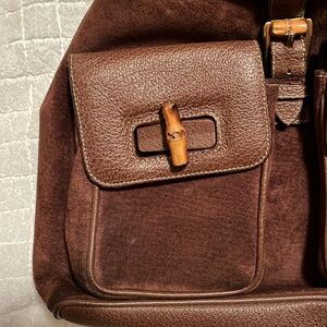 Brown suede bamboo handle backpack. 2 outer pockets, one interior zip. Clean interior. Non-smoking home with no pets. Very good condition.