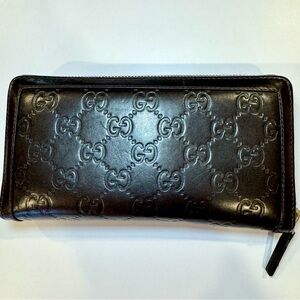 Gucci Sukey GG Logo Dark Brown Leather Zip Around Continental Wallet W Gold Accent. This timeless wallet from Gucci is large enough to hold all of your wallet needs, and is in overall excellent condition! Gently used, this wallet shows signs of normal wear throughout, including some marks on the interior, gentle wear on the exterior, and minor scratches/fading on the hardware; please refer to all pictures.