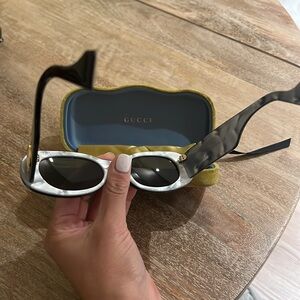 Excellent condition/ black with gold Gucci logo on the sides/ trendy skinny black glasses/ comes with case, cleaning wipe cloth and dusk bag