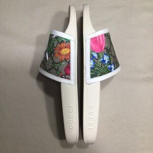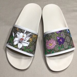 These Gucci Supreme GG floral slides ( I’m original owner) have been worn but are in excellent condition. Only signs of wear in on soles. No two pair of these slides are the same because the cut of the pattern. These slides have an exceptional cut . Large white Lilly is centered on the right slide and beautiful pink and purple flower tops the left . This is definitely a pair of envied slides . Comes with original box and gift bag and two green gucci dust bags. Please look at all pics