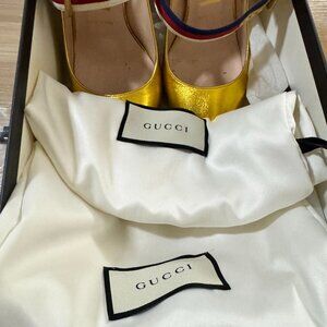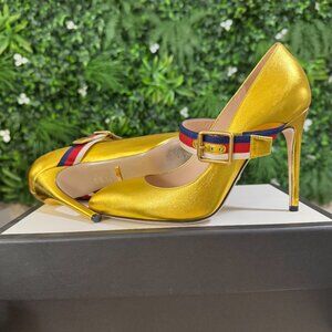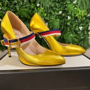 Gucci Sylvie Gold Mary Jane Pumps Heels Web Stripe RARE 7/37.5 EUC