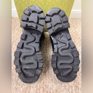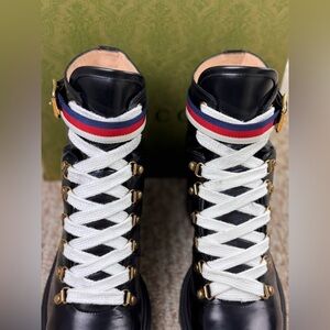 Gucci Sylvie Web Womens Lace Up Calfskin Leather Black Combat Boots Size 39.