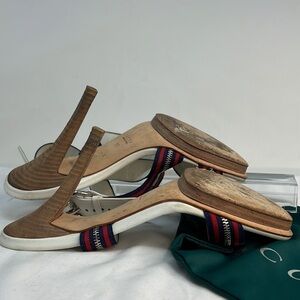Gucci Sz 38 White Leather w/Navy Red Zip Web Zipper Detail Wrap Buckle Heels
