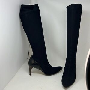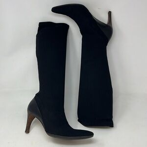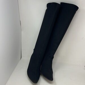This is a lovely pair of Gucci Sz 7 Tall Elastic Sock Boots Pointed Toe 3” Stacked Heel. Leather back strip and back of heel. Easy to pull on and take off. Non slip vibram sole. The heel could use a little touch up at a shoe repair. Overall very good pre owned condition. Full height is 18”
