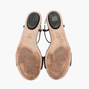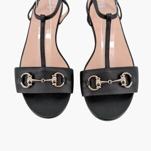 Gucci T-Strap Black Leather Horsebit Flat Sandals Shoes Size 37 US 7 Women's