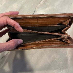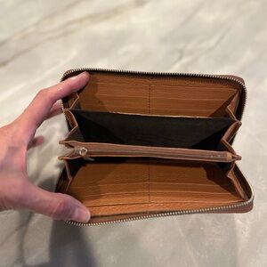 Stylish Gucci wallet in tan leather. Features embossed logo and tassel zipper.