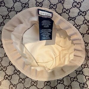 This Gucci bucket hat showcases the iconic GG monogram in a subtle tan hue, offering a sophisticated touch to your accessory collection. Crafted with a structured crown and a wide, sloping brim, it combines style and functionality effortlessly. Perfect for adding a luxurious flair to any ensemble.