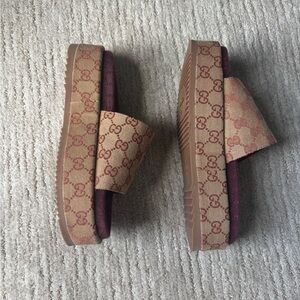 Elegant Gucci slides with signature tan monogram pattern. Ideal for everyday comfort.