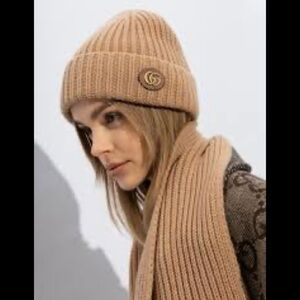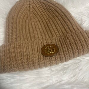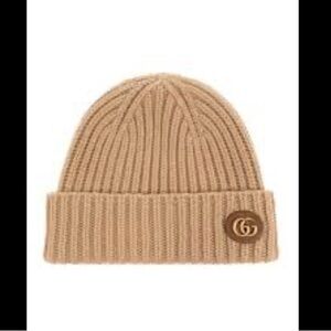 This Gucci hat, in a sophisticated tan hue, features a ribbed knit texture and a subtle logo detail, making it a stylish and warm accessory for chilly days.