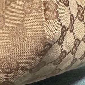 Stylish Gucci tote with iconic GG pattern. Features tan and brown tones with gold accents.